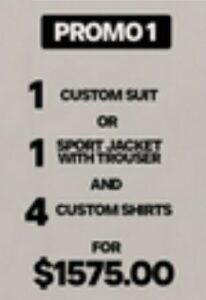 1 Custom Suit or 1 Sport Jacket with Trouser and 4 Custom Shirts $1,575.00