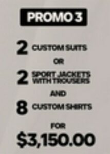2 Custom Suits or 2 Custom Sport Jackets w/ Trousers and 8 Custom Shirts.